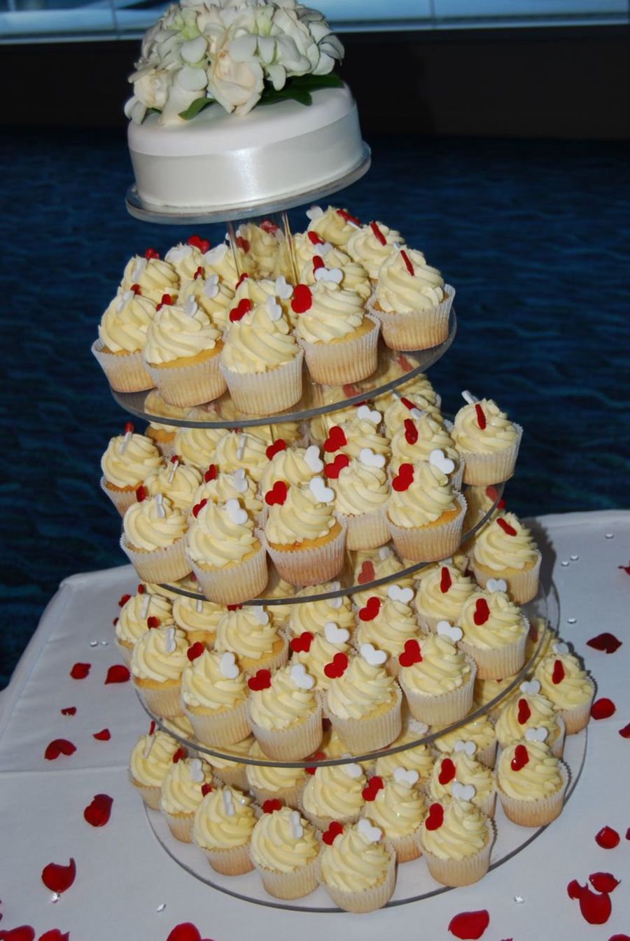 Cupcake tower created for a red and white themed wedding.