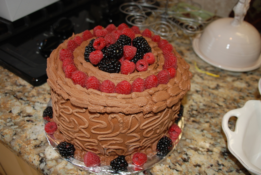 This is a cake I made for my moms friend. Chocolate cake with raspberry filling and chocolate buttercream frosting