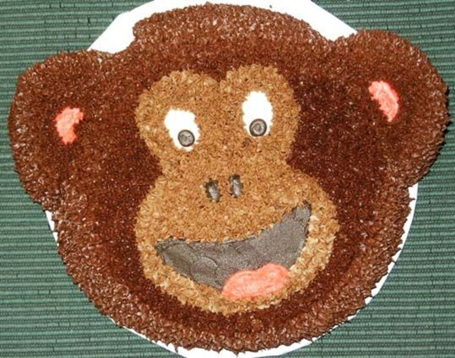 This is one of my son's 1st birthday cakes. He is CMD cookies and cream cake with mostly chocolate buttercream. It is the Animal Crackers pan with the ears moved down. We call him a little monkey so we did a jungle themed party!