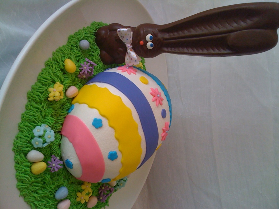 Easter Egg is made from the Wilton 3d Egg pan. White cake with vanilla buttercream and Raspberry filling. Iced in buttercream and decorated with fondanct accents. Grass is buttercream with fondant flowers and store bought candy eggs and chocolate bunny. TFL!