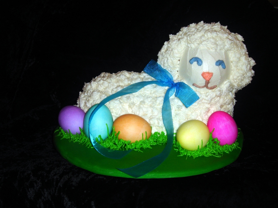 Second attempt at a 3 D Pan, This time it worked yay! It was Italian Cream Cake. Iced in Vanilla buttercream. Used Real dyed hardboiled eggs. And Real Ribbon bow. Made a great centerpeice for our easter dinner.