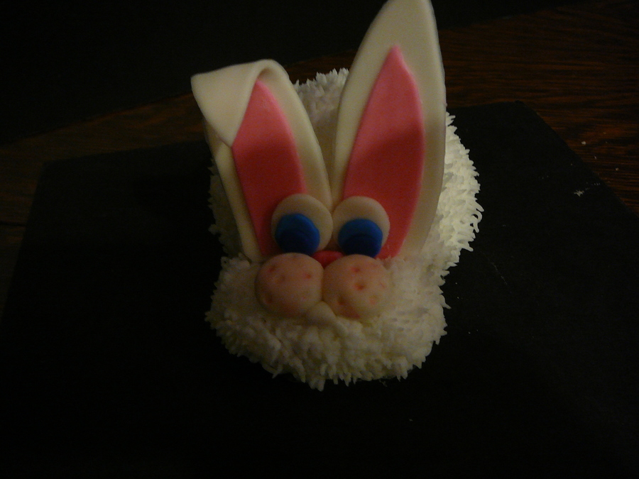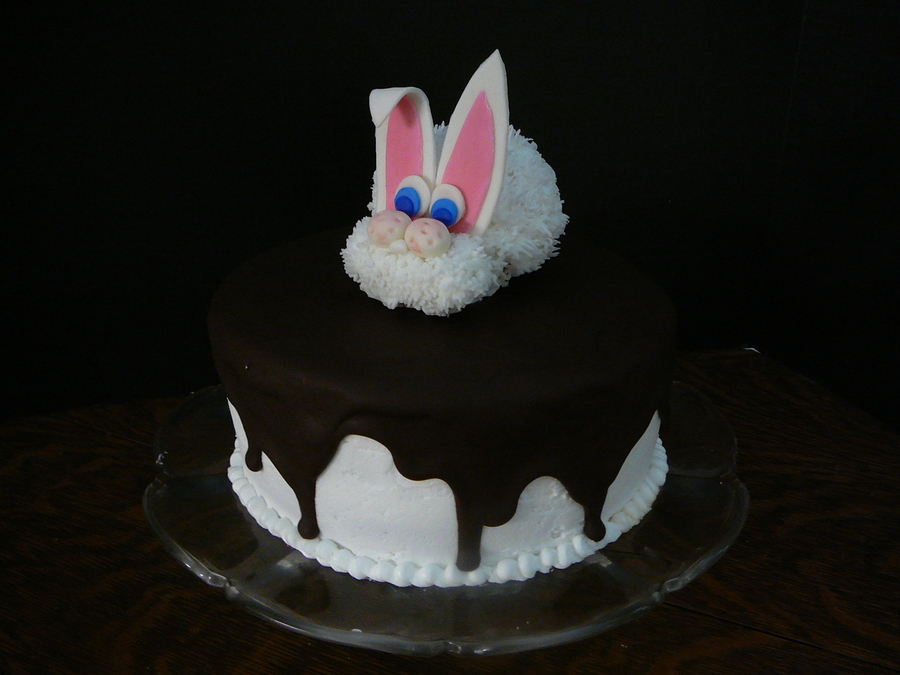 white cake, buttercream icing and topped with ganache (and the Easter bunny)!