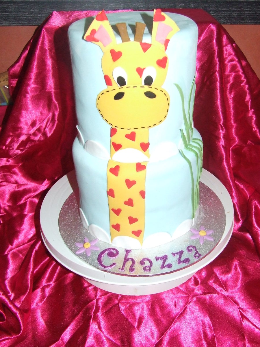 This is a cake i made in a day for my sister's birthday. Mind you, she is 24!! Anyway, I was only given a days notice that she was flying in so considering my time constraints I'm happy with the reuslts! She loved it!! A real giraffe buff!! It was a devils food cake covered with ganache for the bottom double stack, and the top double were dummy cakes. All design credit goes to rkmellis here on CC as I simply googled "giraffe cake" and this cute design came up!! I changed the colour scheme a bit, and made the spots heart shaped to match a cross stitch i had previously made my sister! All criticisms welcome and a huge thank you to rkmellis for the inspiration!!!