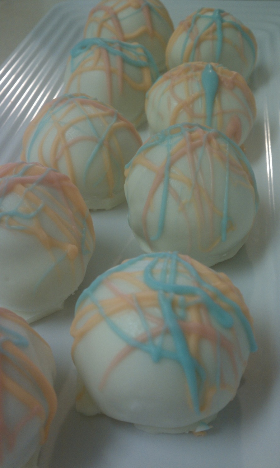 These are my first attempt at truffles. These are confetti cake balls with peanut butter centers and coated in white chocolate, delish!