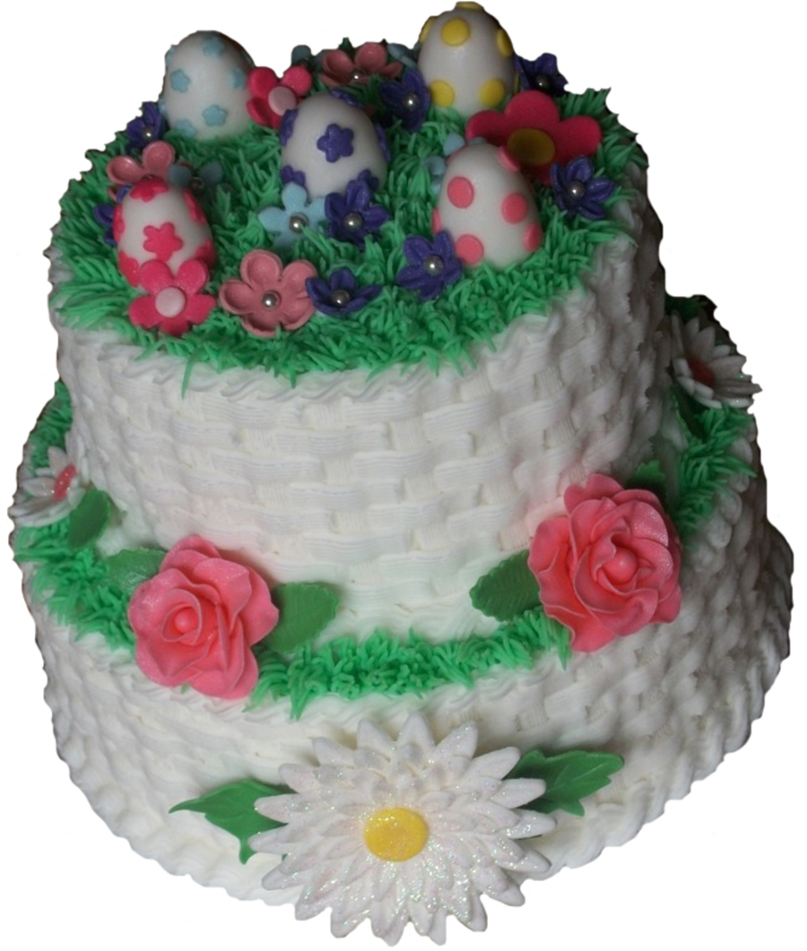 BC basketweave piping with grass tip for green grass. Fondant flowers and eggs. TYFL!