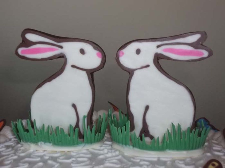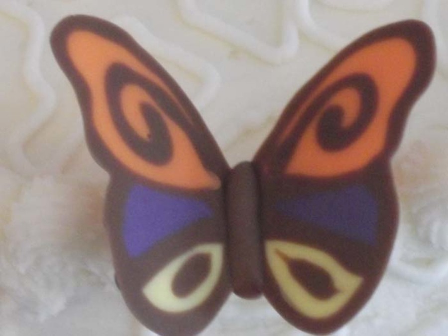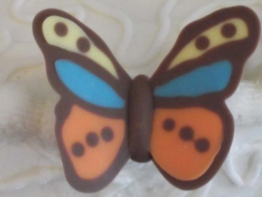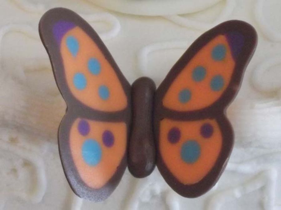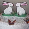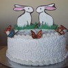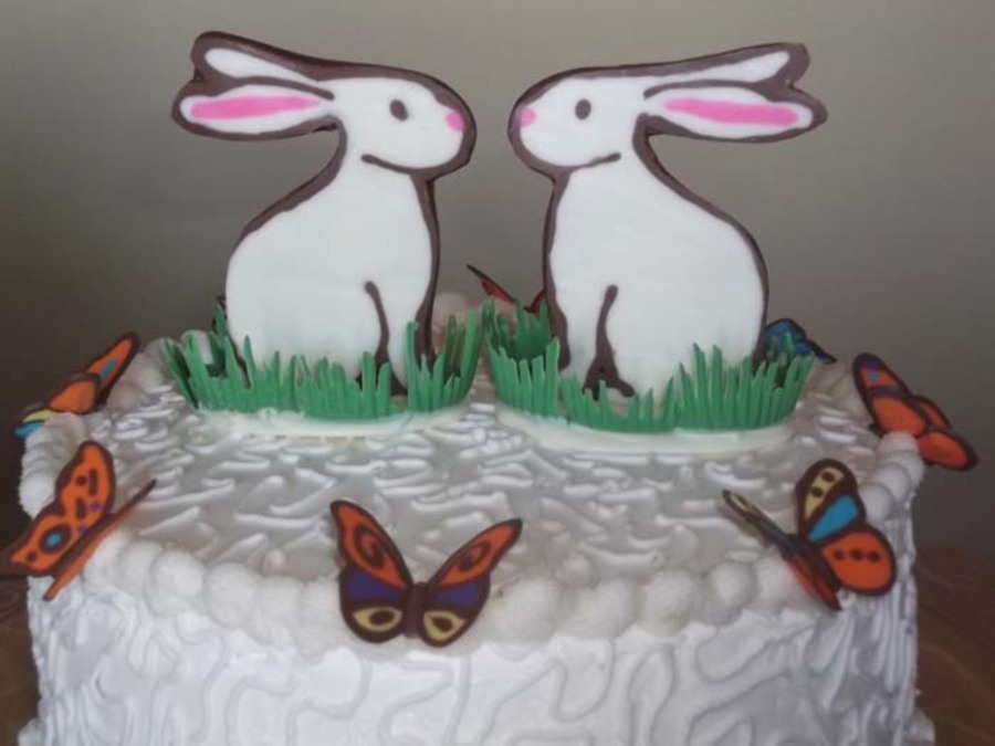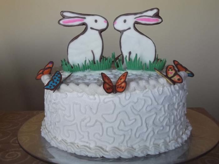 An experimental Easter cake. New red velvet recipe and crusting butter cream. The BC did not crust properly so I could not get it very smooth at all - need to experiment more. Attempted Chantilly lace - it does cramp your hand! 2nd time with chocolate butterflies, but these are smaller than my first ones. 1st time double sided piped chocolate bunnies. 1st time using cupcake liner to make chocolate grass. Everyone loved and enjoyed it, though it could have been much-much better all around had I had more time - misjudge timing along with guests and dinner preparation -ugh-
