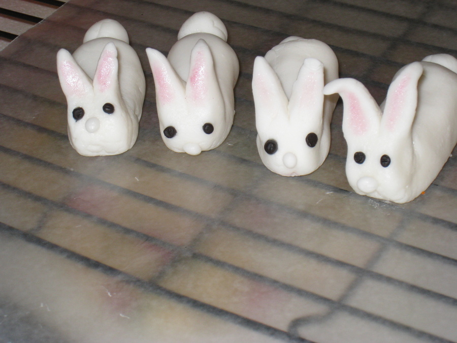 Pound cake with buttercream covered in Fondant with crushed cookies for soil. Flowers are Fondant. Bunnies are gumpaste. Thanks for looking!