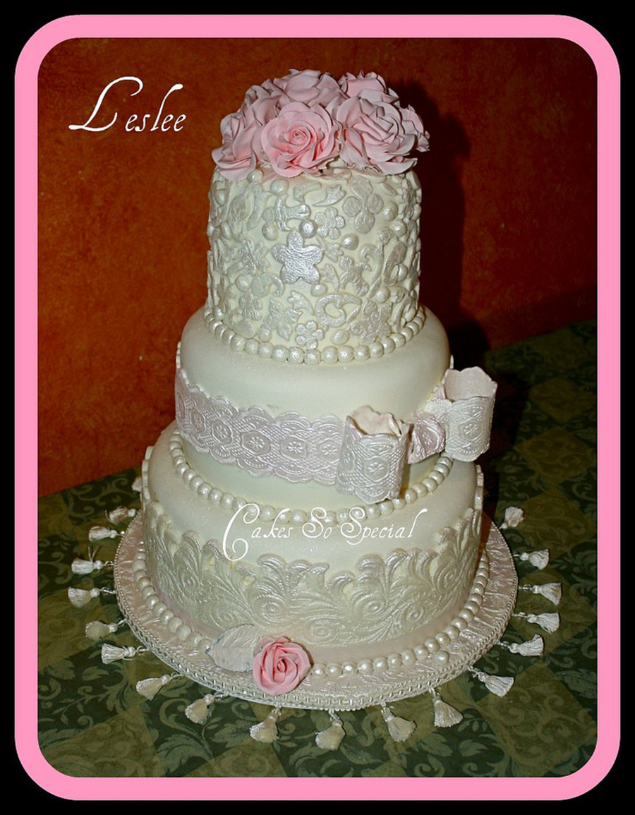 Butterpecan cakes with lace wrap, bow, cut outs and pink gum paste roses. Thanks for looking.