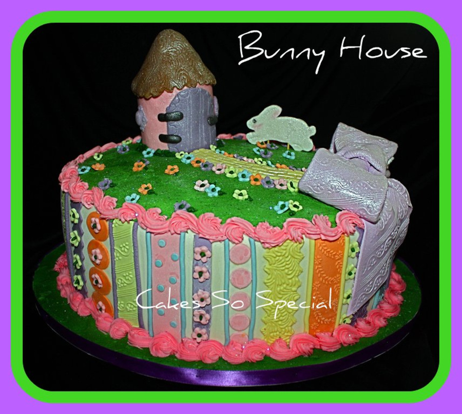 13" butterpecan cake with a Bunny House, bunny, bow and sides decorated with Easter colors