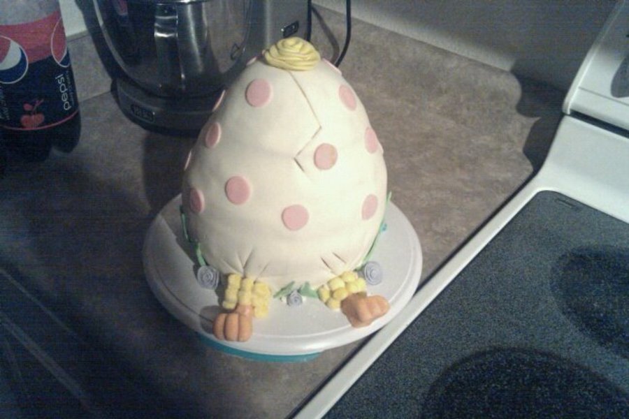 White Cake, with buttercreme icing, Shaped into an egg, Covered in Fondant, Decorated in Fondant.