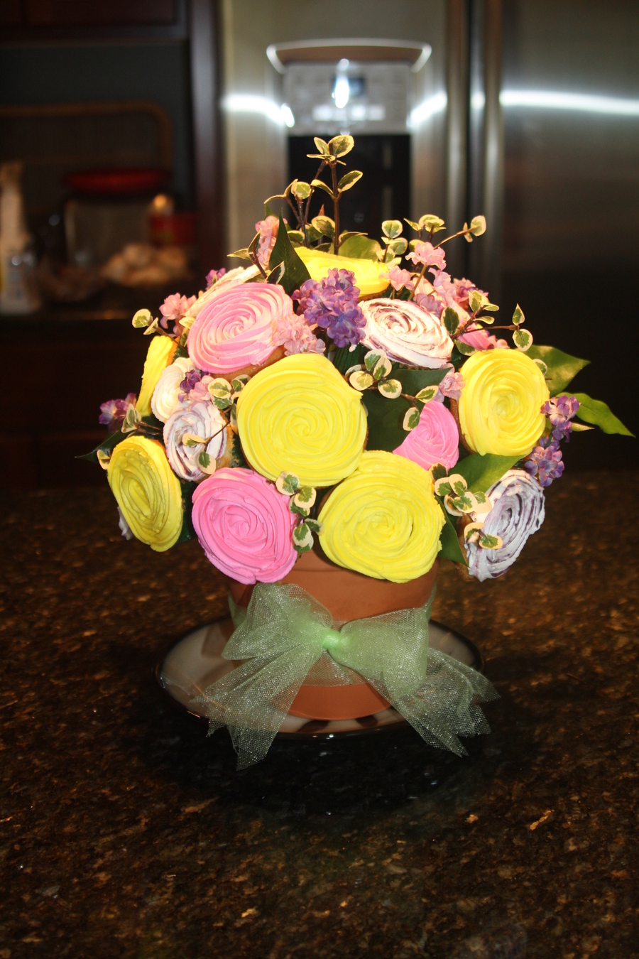 My first attempt at a cupcake bouquet - can't wait to make another! Used regular & mini cupcakes and silk flowers as fillers.