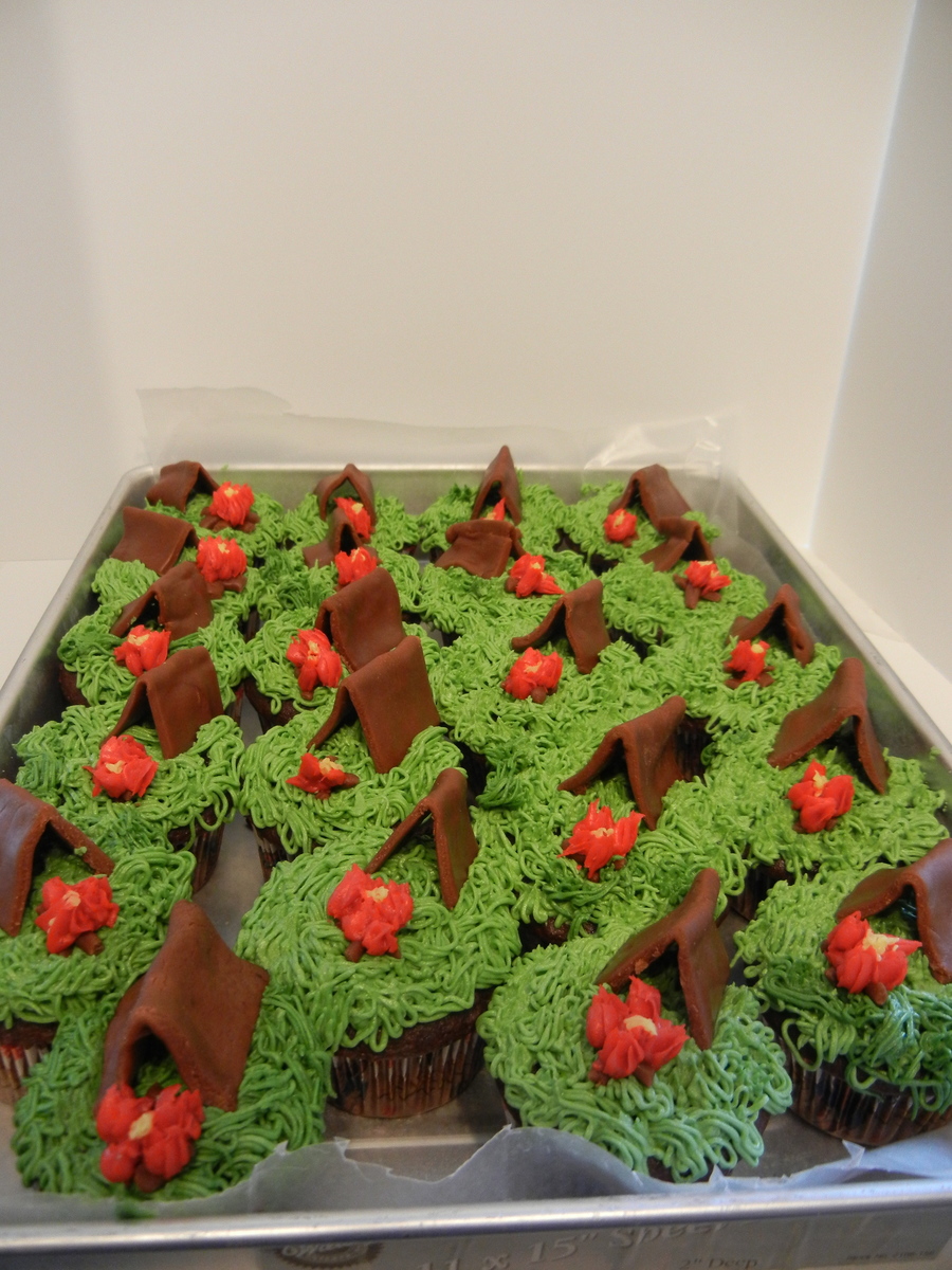 Just a camping themed cupcake for the cub scouts game party that was held today. It took 3 hours to make. Buttercream frosting with the tent made out of chocolate fondant. Pretty explanatory- or i'm just horrible with explaining things, I guess. Chocolate Betty Crocker cupcake mix.