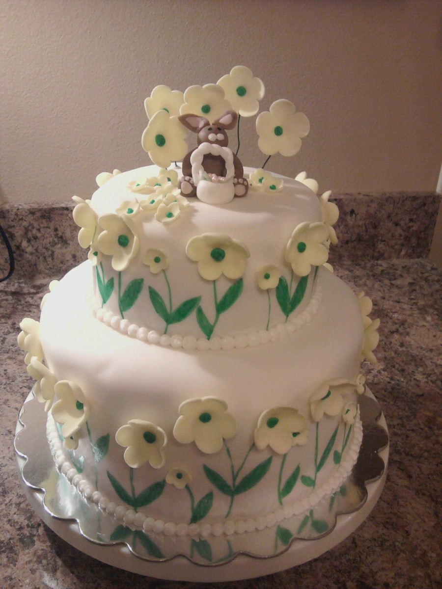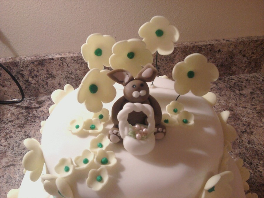 Just made this one for the kids. My daughter wanted the easter bunny on top. covered in fondant and all decorations are fondant. Just a fun little cake to make.