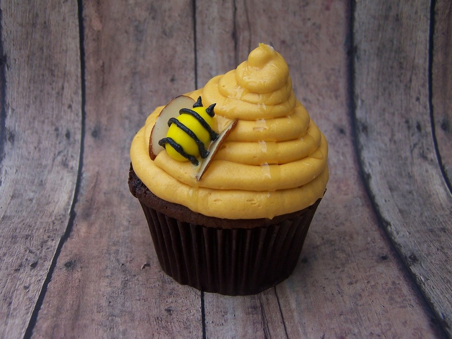 Chocolate Cake with butter creme beehive, chocolate covered peanut and almond slices for wings...used black piping for stripes.