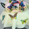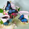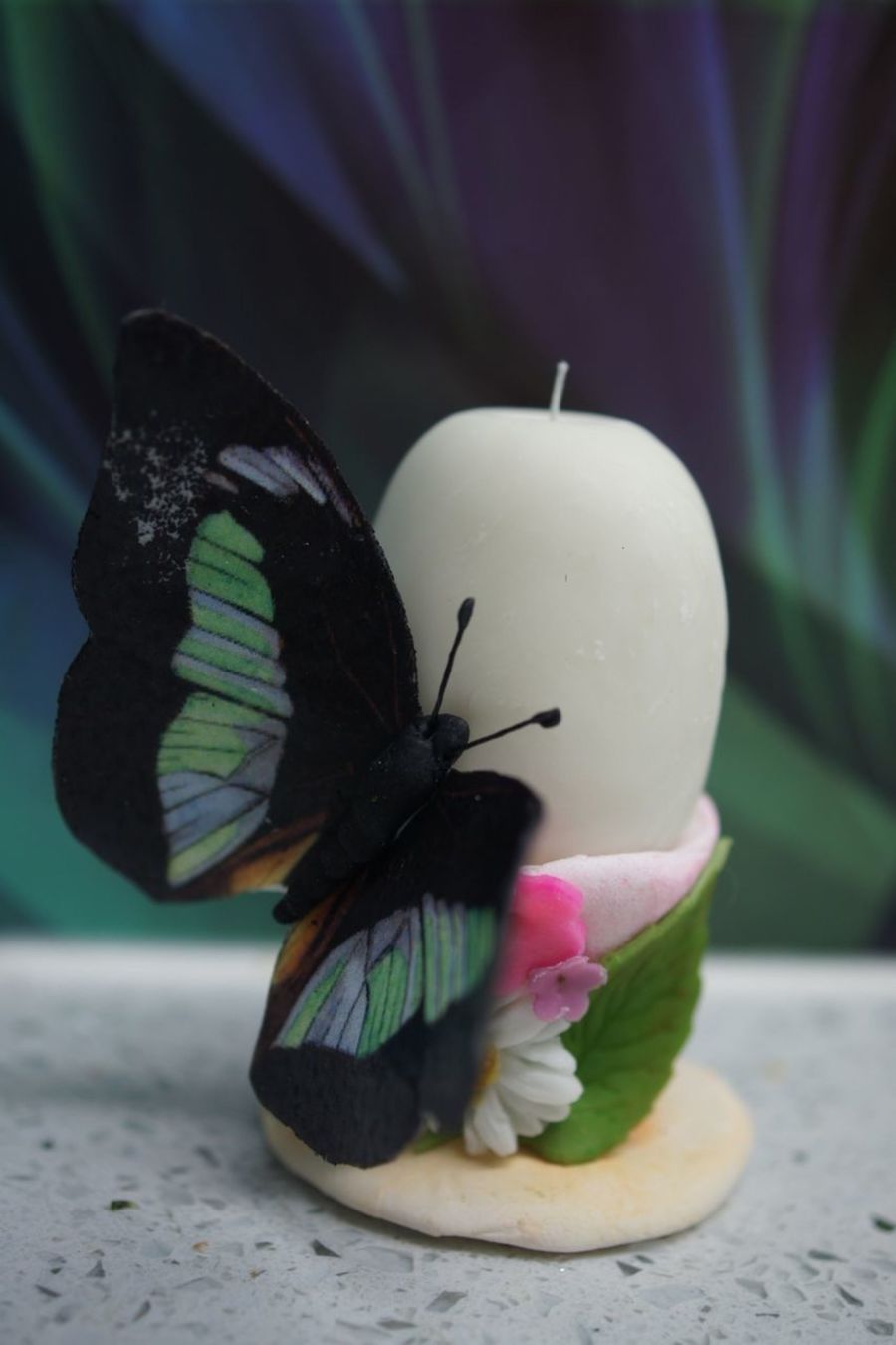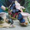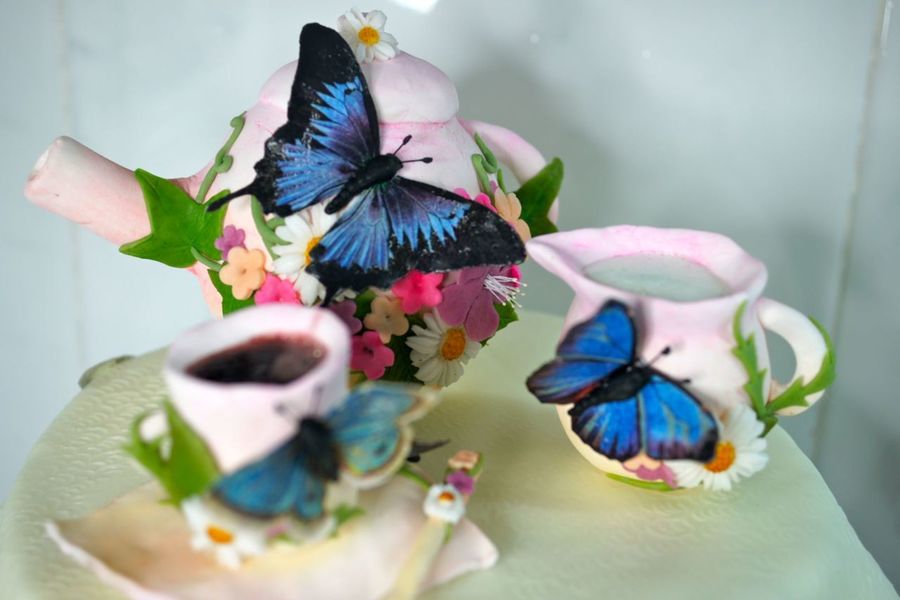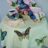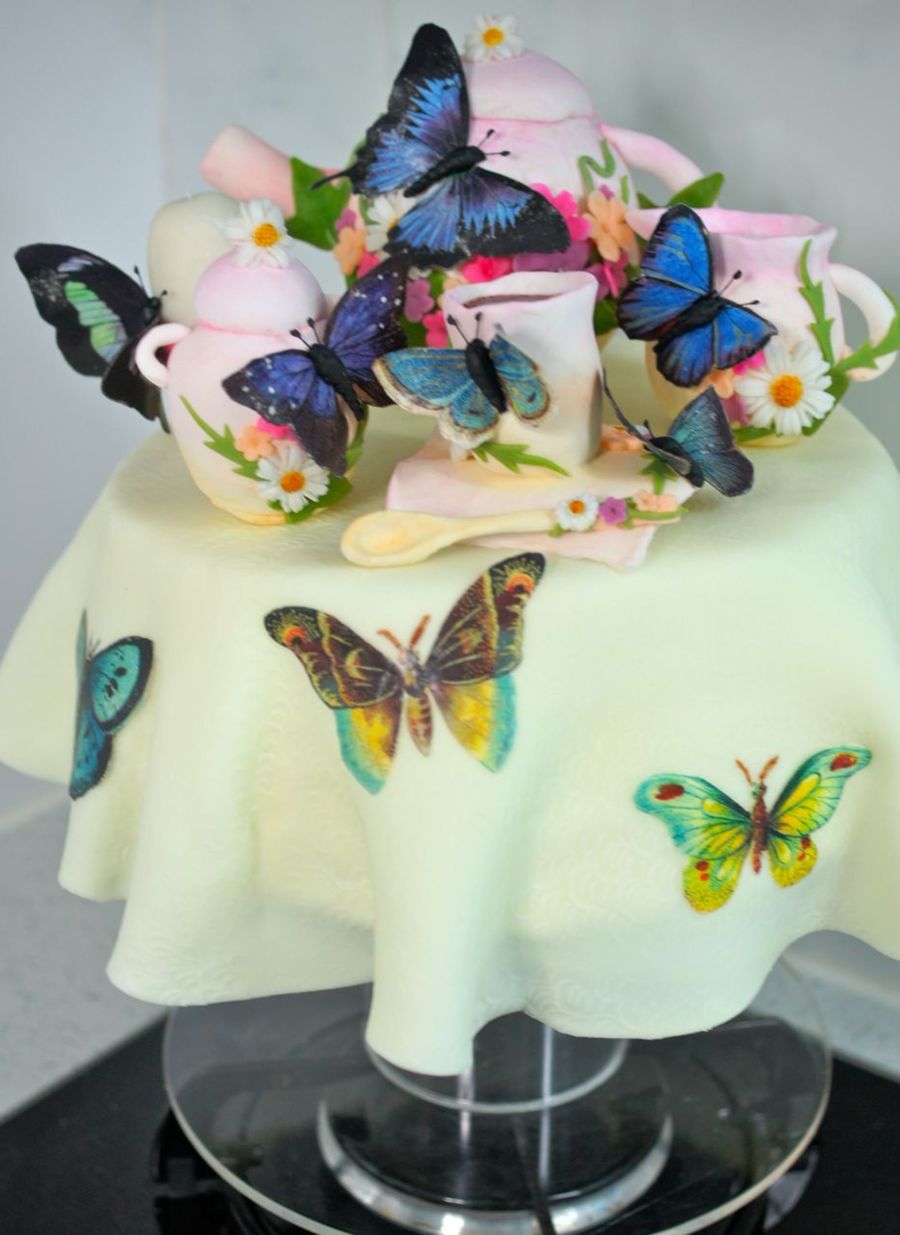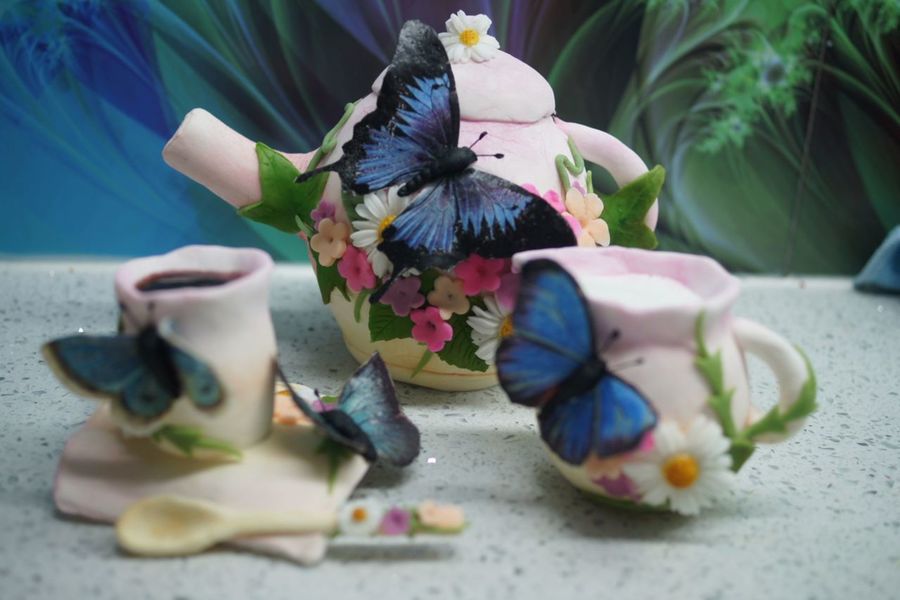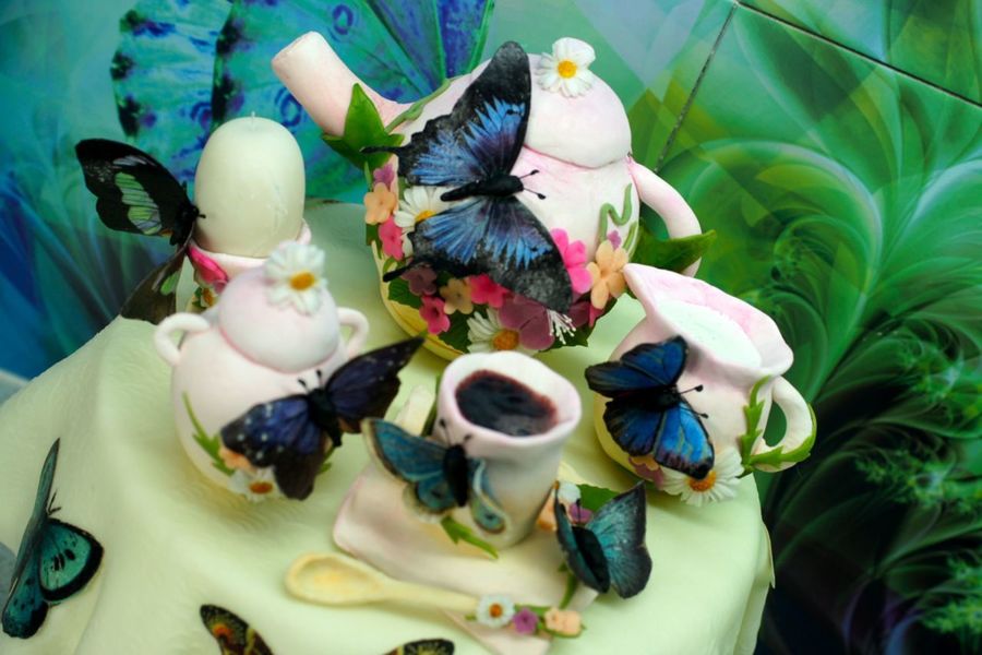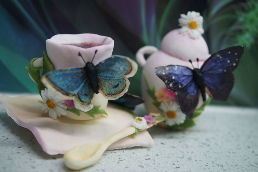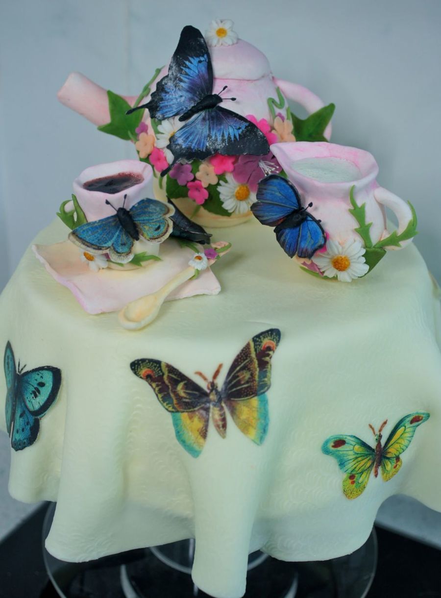 Covered with fondant-gumpaste "tablecloth" with rice paper butterflies, teapot, cup, saucer, spoon etc. are cold porcelain with gumpaste flowers and rice paper butterflies.