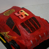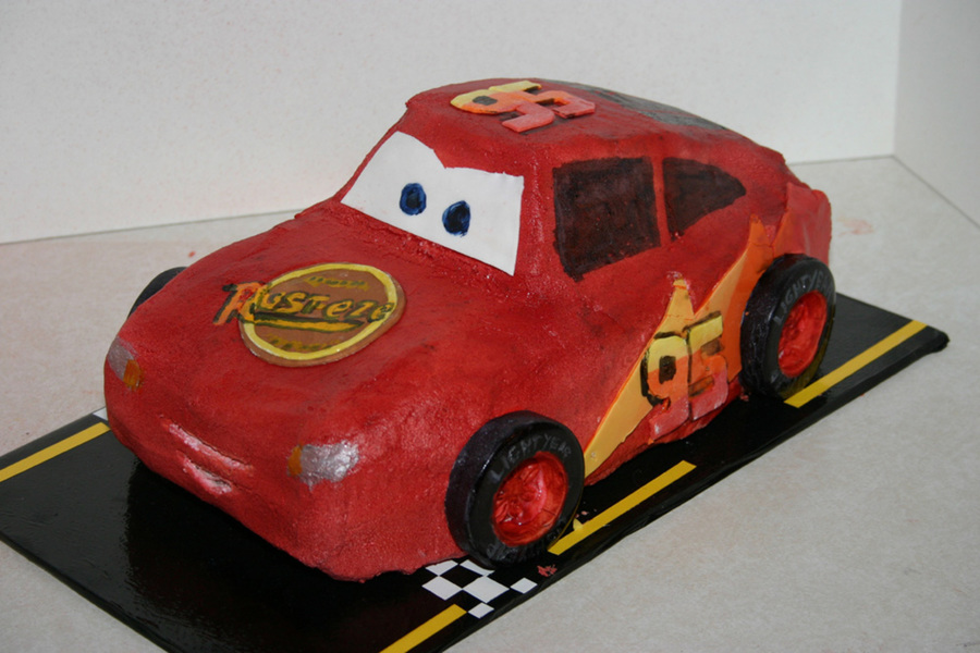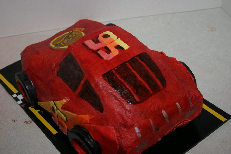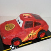 Sculped and air brushed car, hand painted windows and logo, windshield is fondant. Rolled together yellow,red and orange fondant to make numbers and lighting.