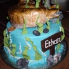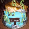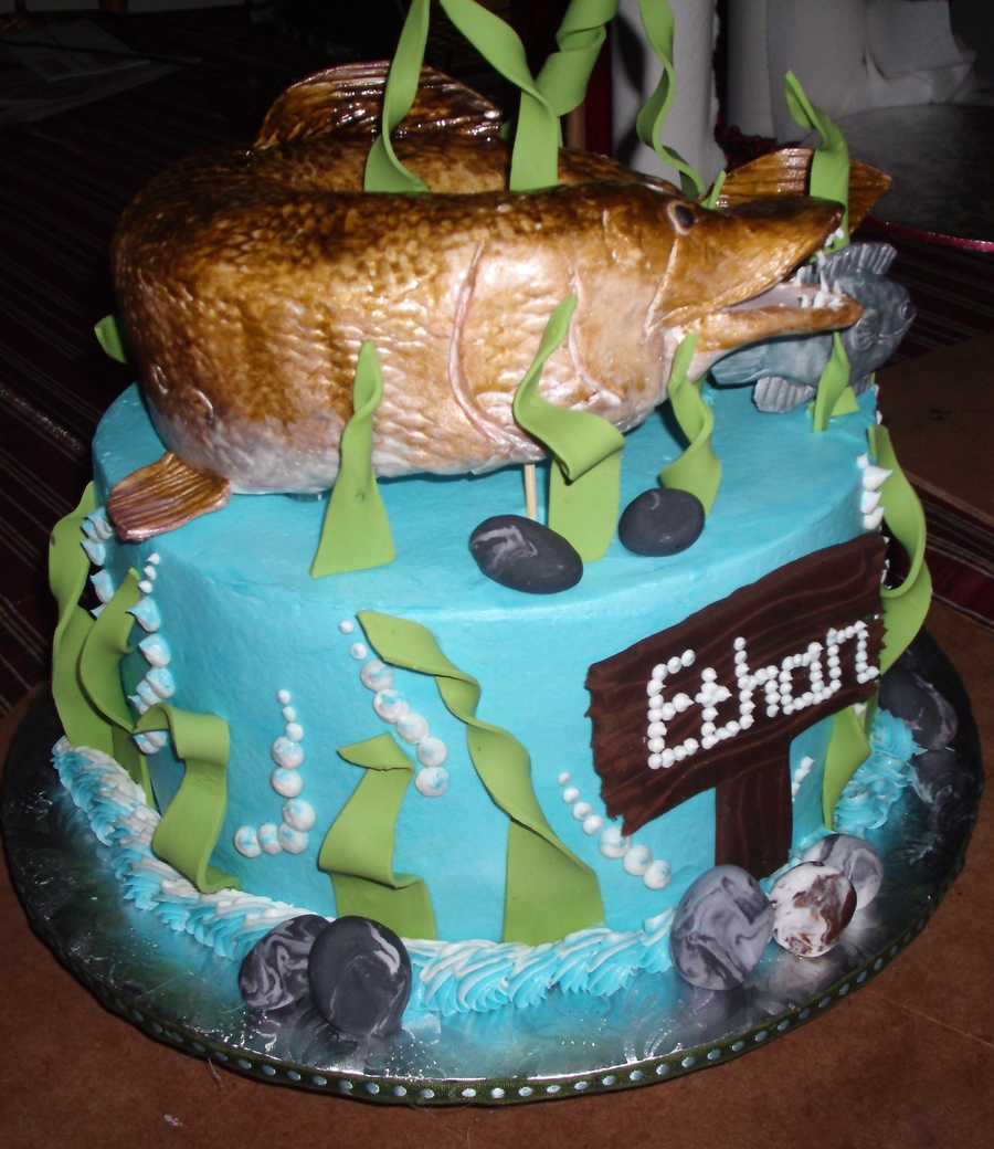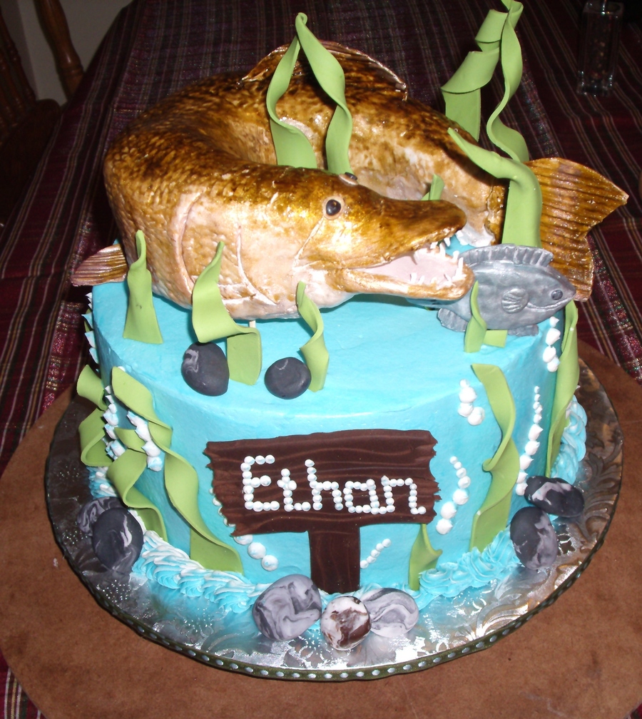 Muskee cake at the request of the birthday boy! Fish is RKT covered in fondant and painted w/ tinted piping gel and corn syrup for shine. Other accents are fondant. Thanks for looking!