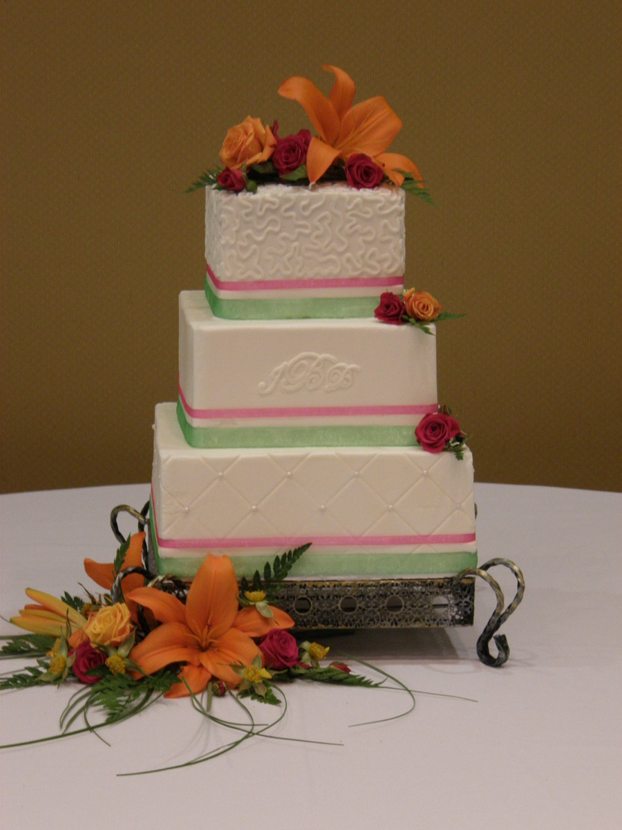 3 tier square, all BC, cornelli, monogram (hand piped) and quilt. Guests were served choice of cake or pie. Lot of work, but fun to do something different for a change too.