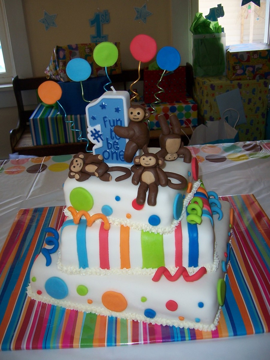 The top tier is white cake torted with buttercream, second tier is orange torted with orange buttercream and the bottom is chocolate torted with raspberry filling. Each tier is covered with MMF - the top was vanilla flavored, the second tier was orange flavored and the bottom tier was raspberry flavored. Monkeys were made with chocolate MMF and accents are vanilla MMF.