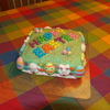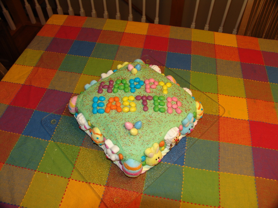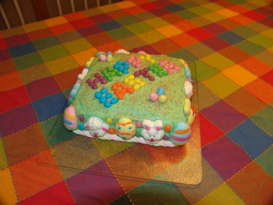 This Easter cake is covered in buttercream frosting with jellybeans, marshmallows, colored sugar and Reese's eggs for decorations. The cake inside was strawberry and it was delicious!