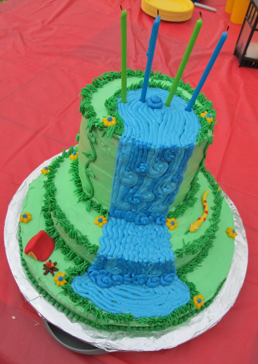 Chocolate and yellow layers, 12 in, 10 in and three 6 in. My youngest son requested a waterfall cake for his 4th birthday