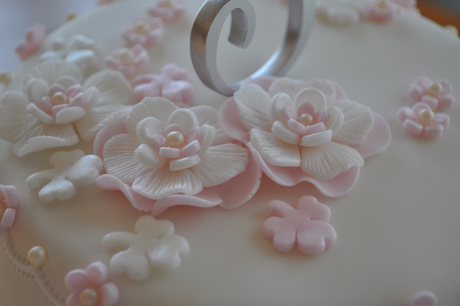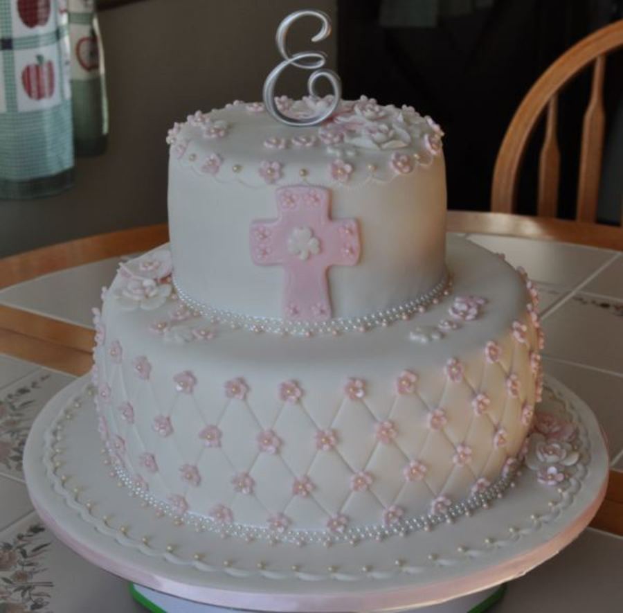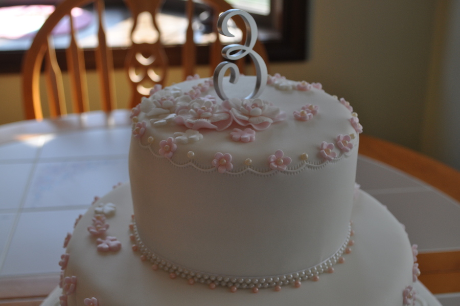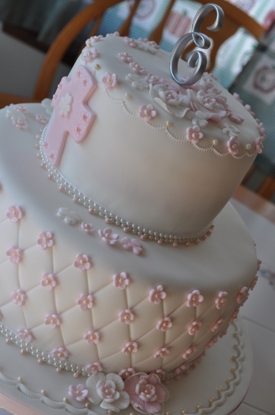 Design originally done by yummysweettreats. Emma's mom found this cake and asked if I could make it for her princess' special day! I am in LOVE with this cake and so excited with how it came out! It looked even better in person! 10inch & 6 inch tiers. Cake is all vanilla with bottom tier having a whipped vanilla cream filling and sliced strawberries/top tier is filled with a whipped chocolate cream - YUM! Covered in fondant with all fondant decorations and sugar pearls. This was my frist time trying out the crimping and quilting technique. TFL!
