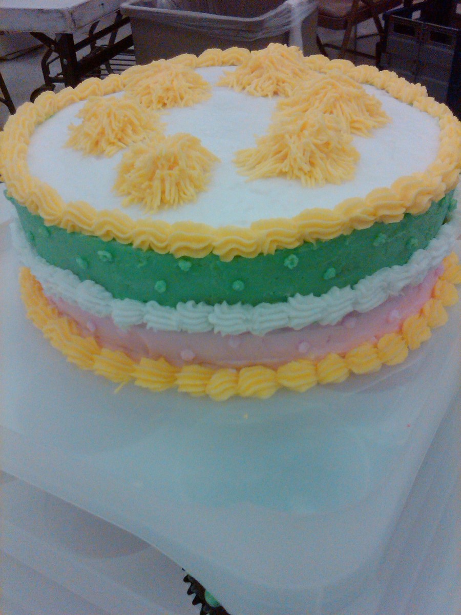 This was my second Wilton cake. It has pink buttercream on the bottom layer, green on the top layer, and a white top. Yellow borders and shaggy mums on top.