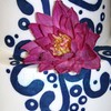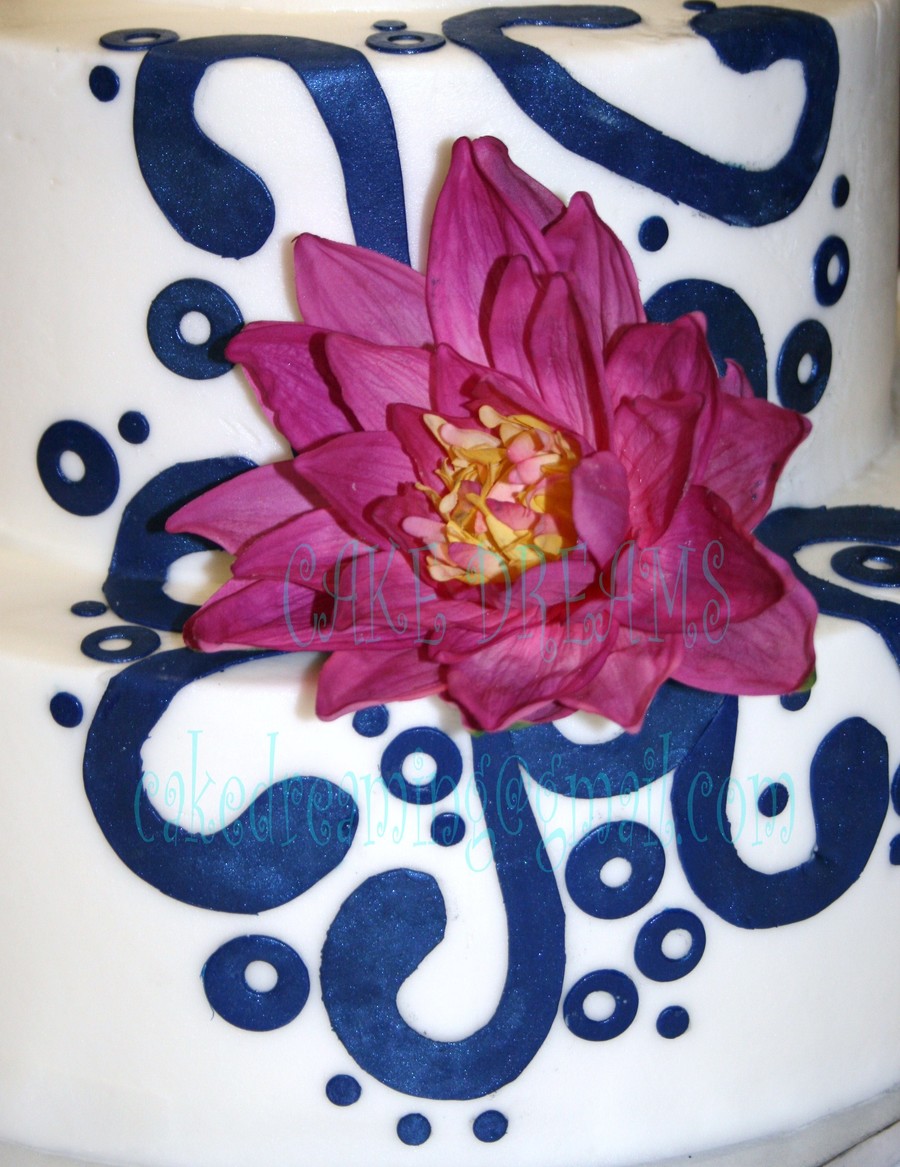 Cake is iced in buttercream. Accents are gumpaste dusted with luster. Flower is silk