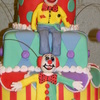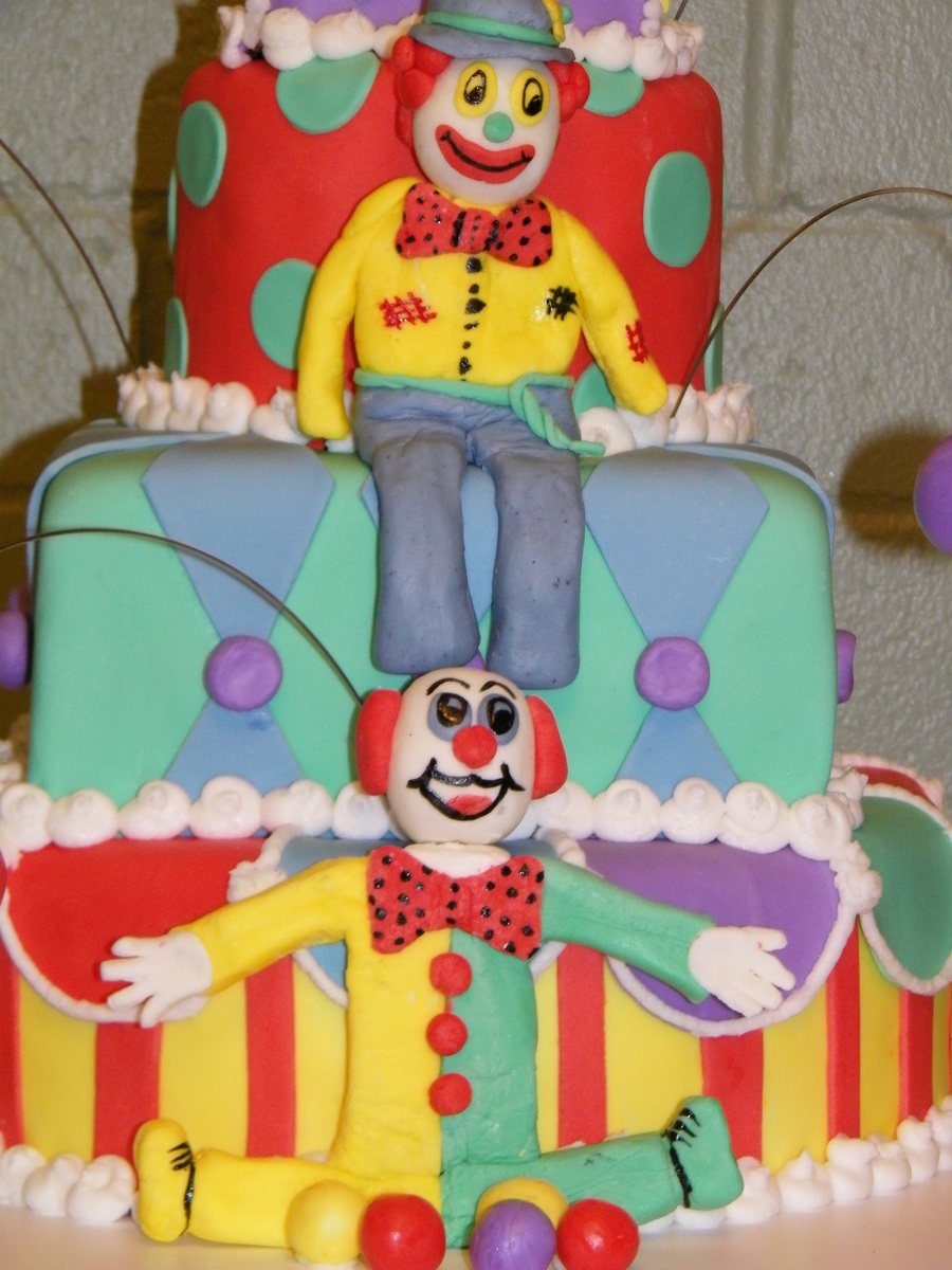 This is a 4 tiered cake, 12' round, 8' square, 6' round, 4' square. All decorations are made out of MMF, including the clowns and balls. The wires are Duff, bought at Michaels. So much fun to make.