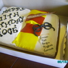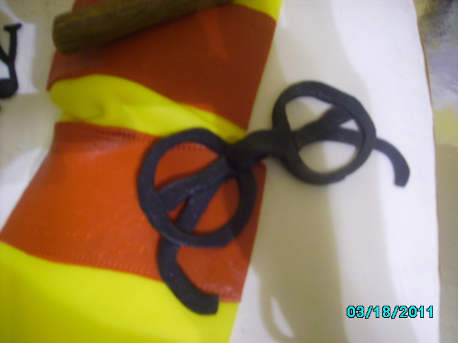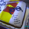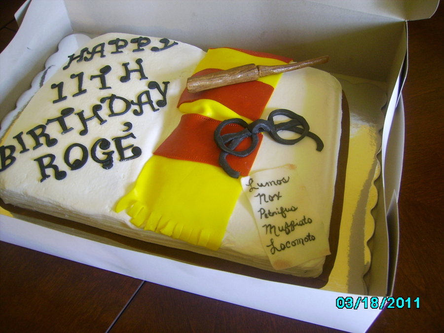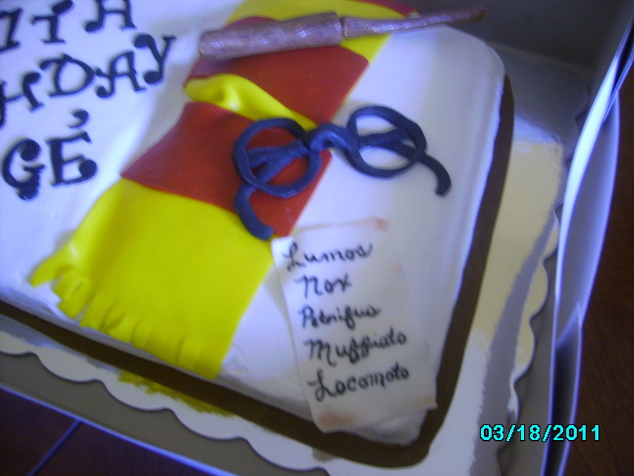 Yellow cake, white buttercream hand carved book, fondant glasses, gumpaste wand, rolled thin gumpaste for spell paper, fondant scarf.