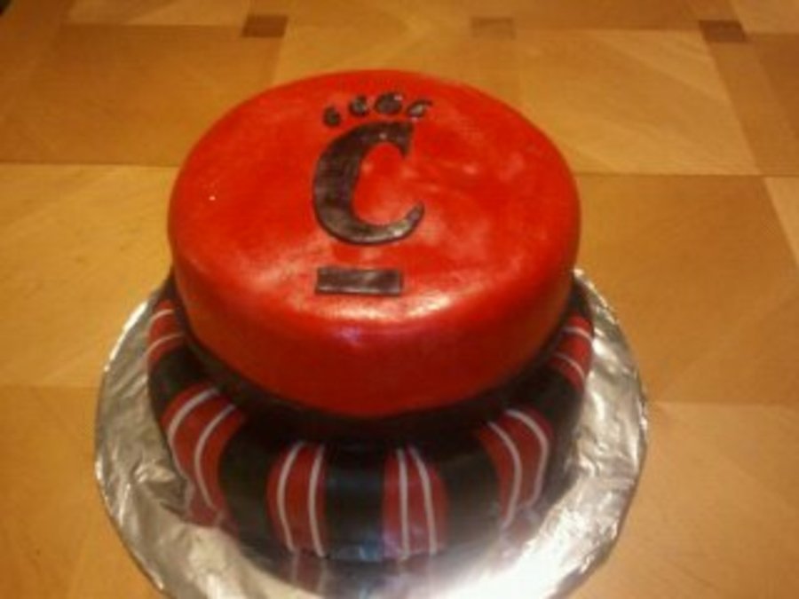 This was a U.C. Bearcats cake that I made for a co-worker of mine. I used black m&m candy for the trim. I made my own ste3ncil for the bearcat symbol and cut it out onto black fondant.