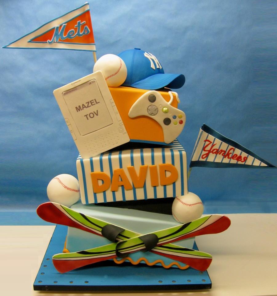Bar Mitzvah cake for a boy who likes baseball, skiing, xbox and his Kindle.