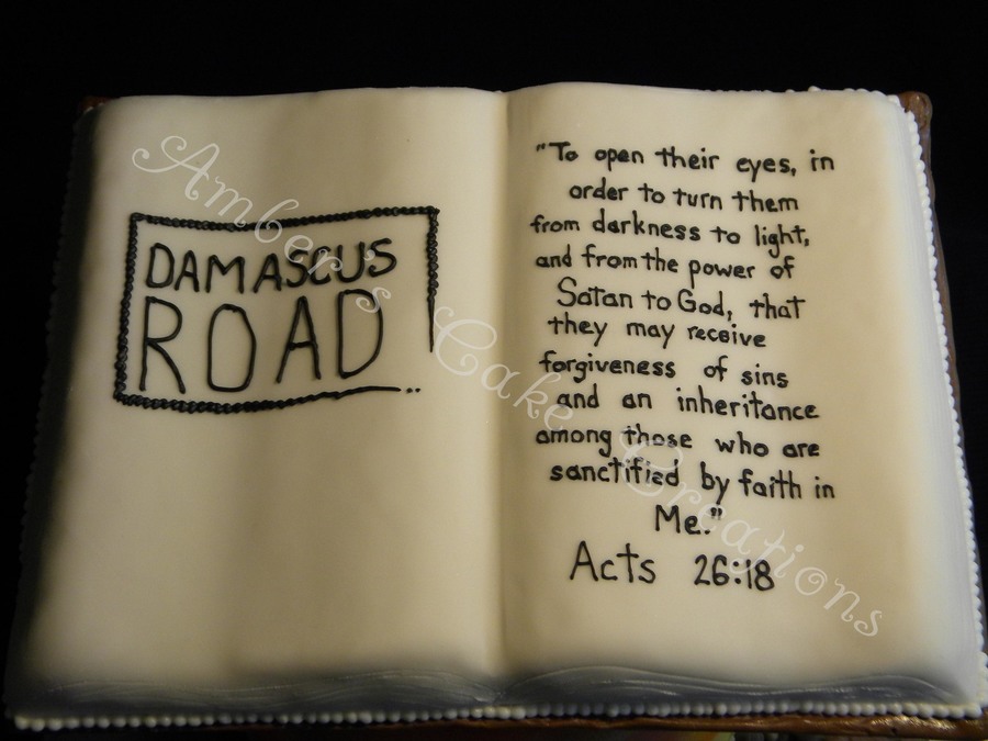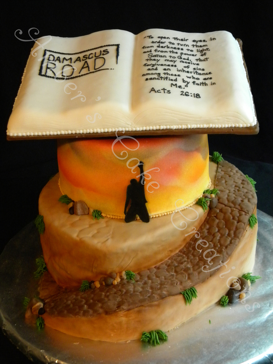 I made this cake for the grand opening of my friend's book store, Damascus Road. It was my first time doing a book, first time carving a road, and my first time piping that much verbage on a cake! Oh, and my first time using the airbrush on a cake. Lots of firsts on this one.