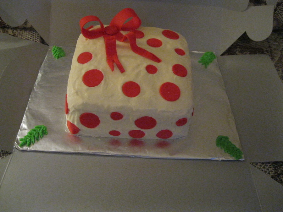 Square Christmas box, cream cheese/buttercream icing, red fondant bow and circles.
