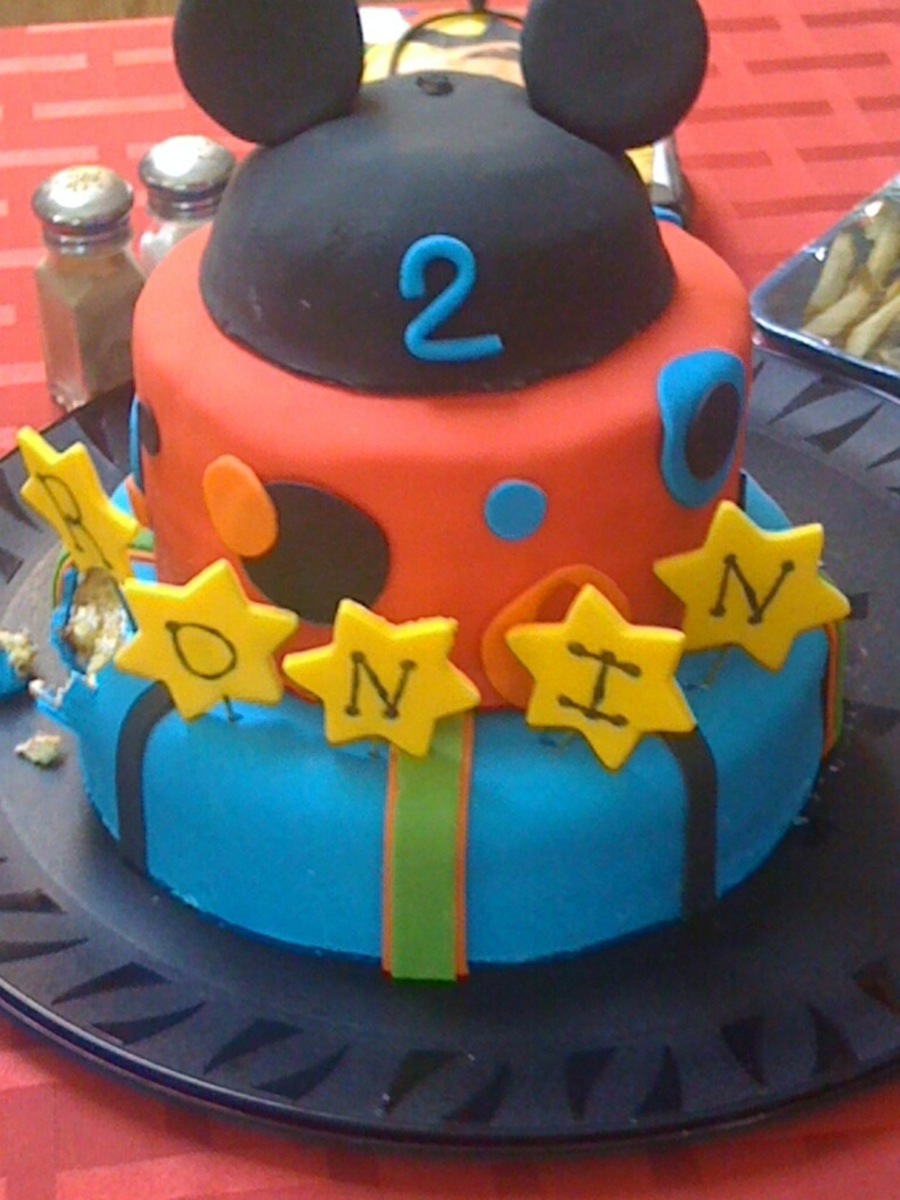 The classic Micky hat! Hat is gluten free cake with cookies covered in fondant for the ears! I got the picture after my nephew, the birthday boy, grabbed a chunk from the side!