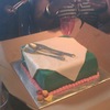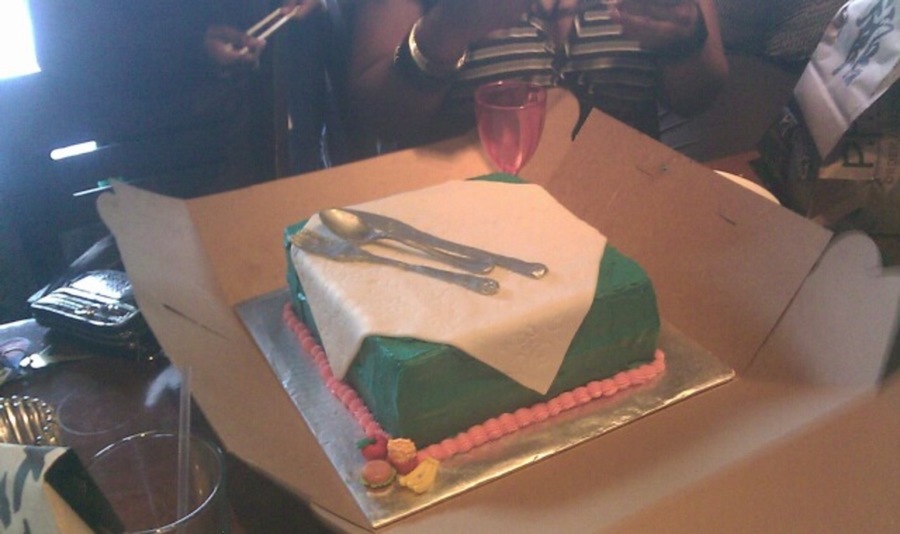 Simple strawberry cake iced in buttercream. The napkins is fondant on top. The silverware was made out of 50/50 fondant and gumpaste. Then painted with silver glaze. The cup and food I bought at the party supply store.