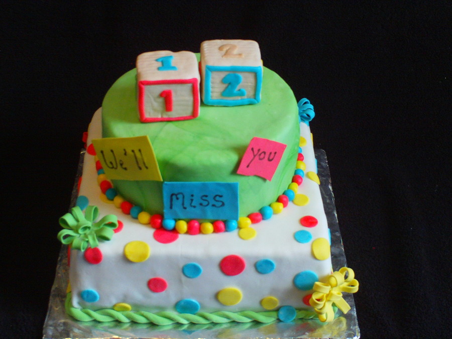 This is my first 2 tiered cake. The cake is chocolate with strawberry filling, and chocolate icing. I covered the cake in fondant, and the accents are made with gum past. The blocks are rice crispy treats covered in fondant.