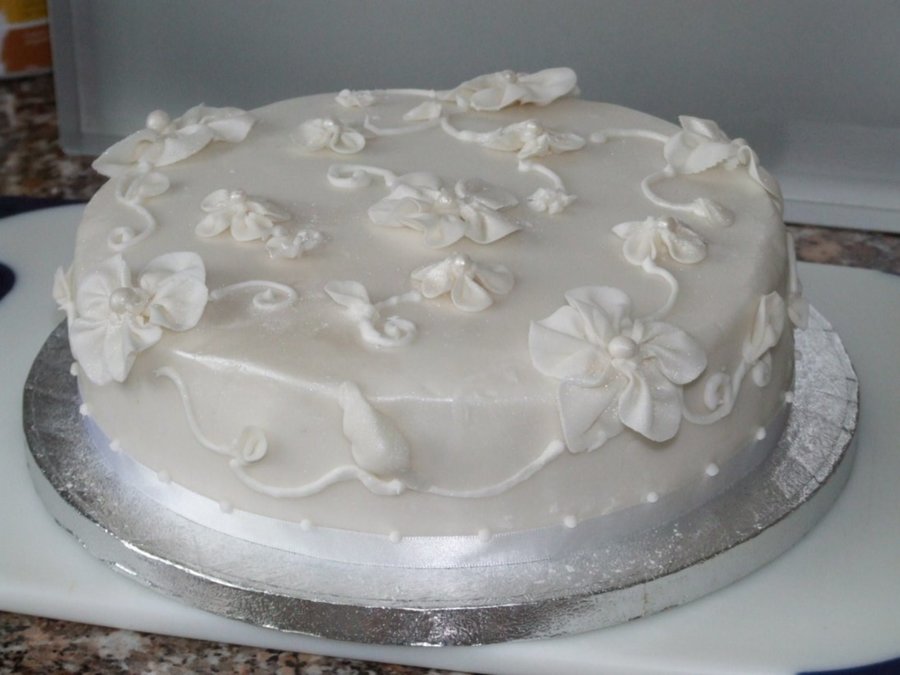 Sponge cake iced with sugarpaste and handmade flowers