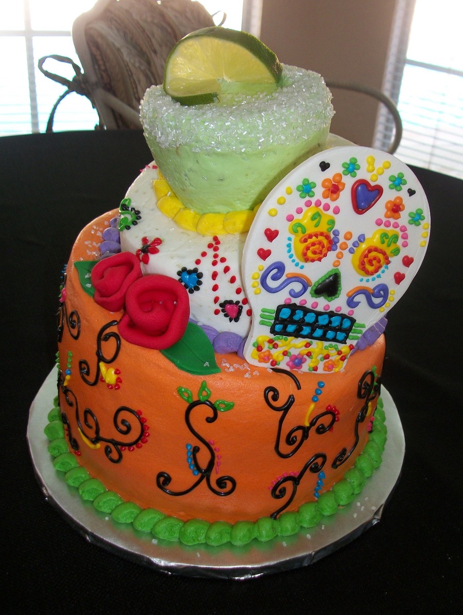 Happy Cinco de Mayo!! 3-tier topsy-turvy cake. Bottom tier is dark chocolate kahlua cake with kahlua filling, frosted with pina colada buttercream. Middle and top tiers are margarita cake filled and frosted with fresh lime buttercream. Decorations are fondant, gumpaste and royal icing. Oh, and a fresh lime and sugar crystal "salt." And yes, I am aware that the skull is usually associated with Dia de los Muertos, but I think he looks cute on this cake. :)