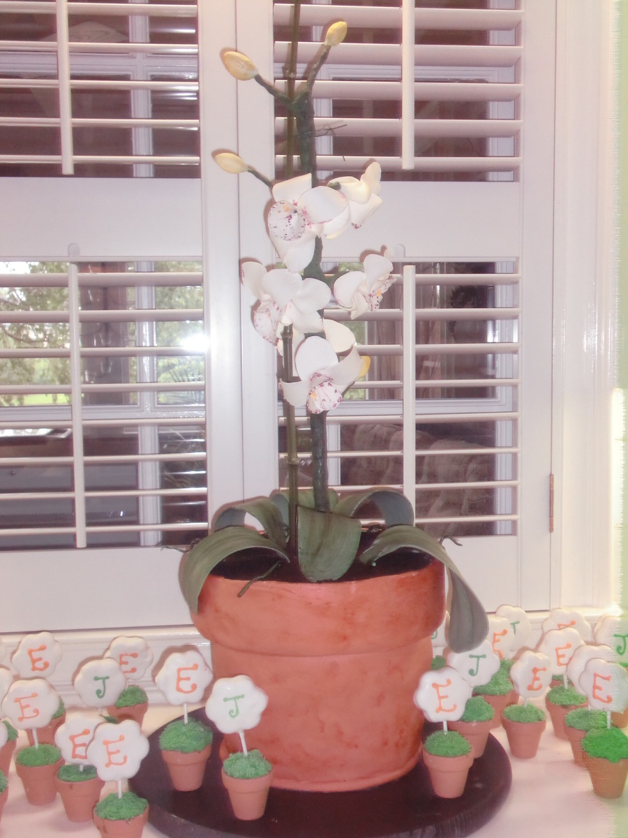 This is a groom's cake for a groom that is a horticulturist. The flowers and leaves are gumpaste and the flower pot is cake with oreo crumb dirt.