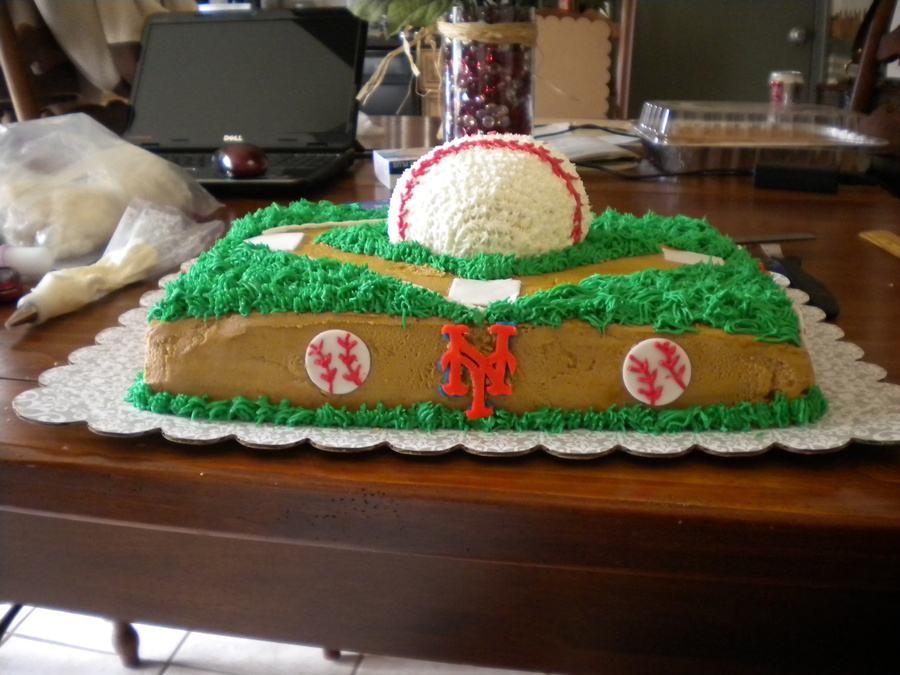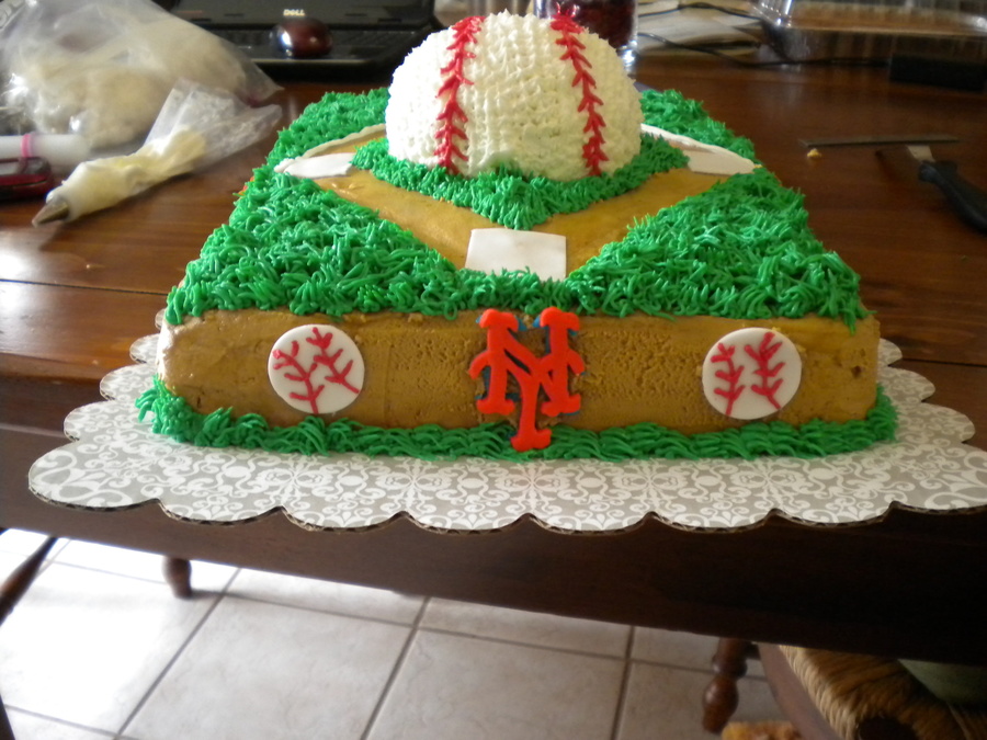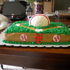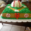 Entire cake covered in buttercream. "Outfield" was made with peanut butter icing. Filling was vanilla pudding & fresh bananas. Baseball was star-tipped & then piped. Logos were made out of fondant.