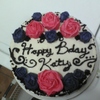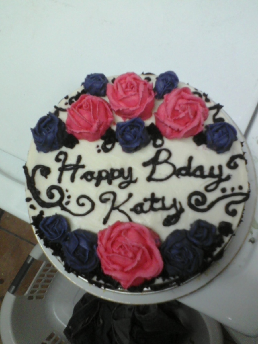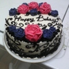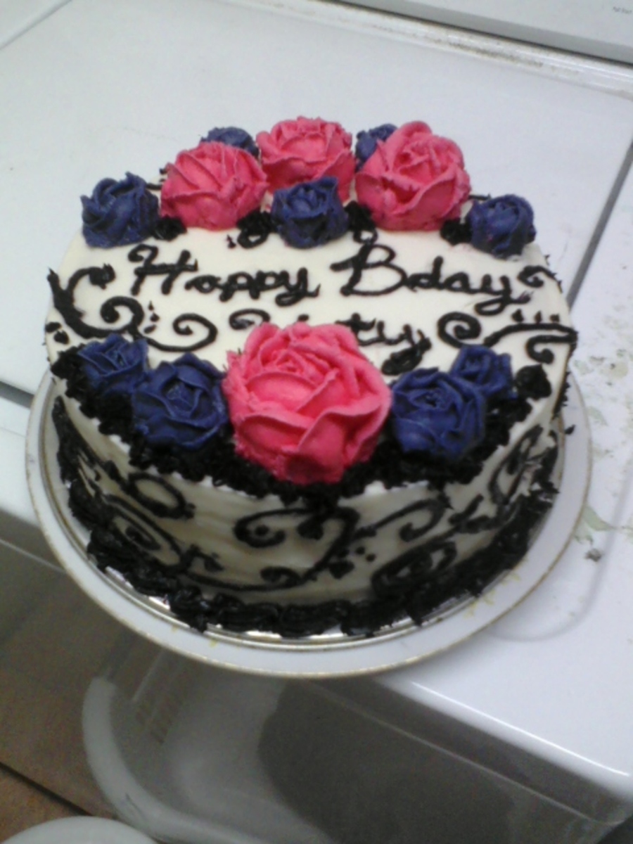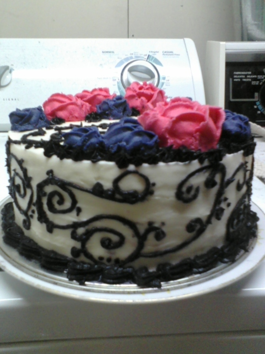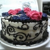 Vanilla cake with black scroll work and buttercream flowers