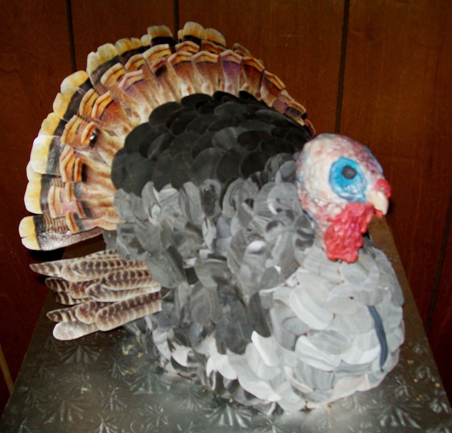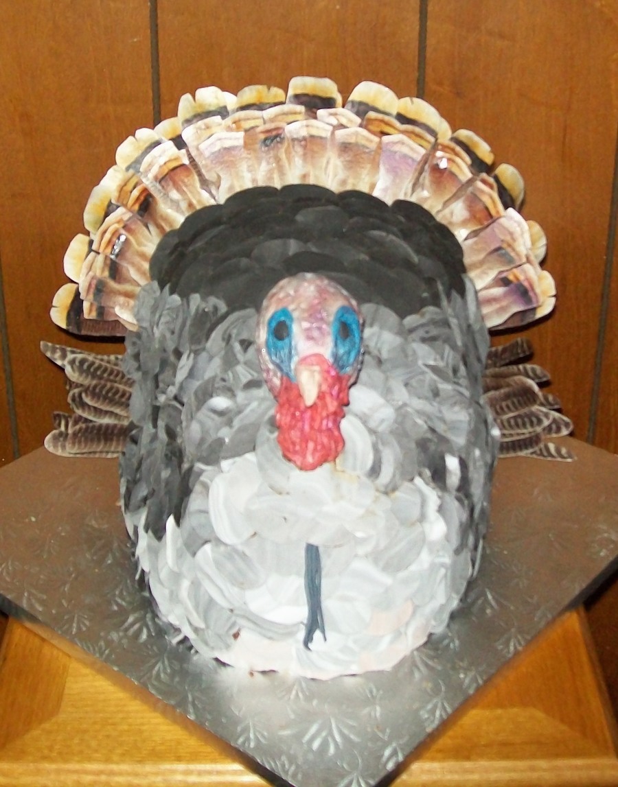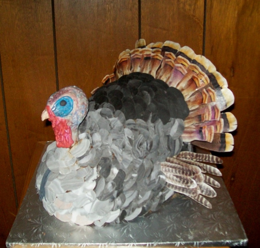 They wanted a turkey with feathers and a beard so I tried my best. The large feathers are printed rice paper. All other decorations are a mixture of modeling chocolate and fondant. Thanks for looking.