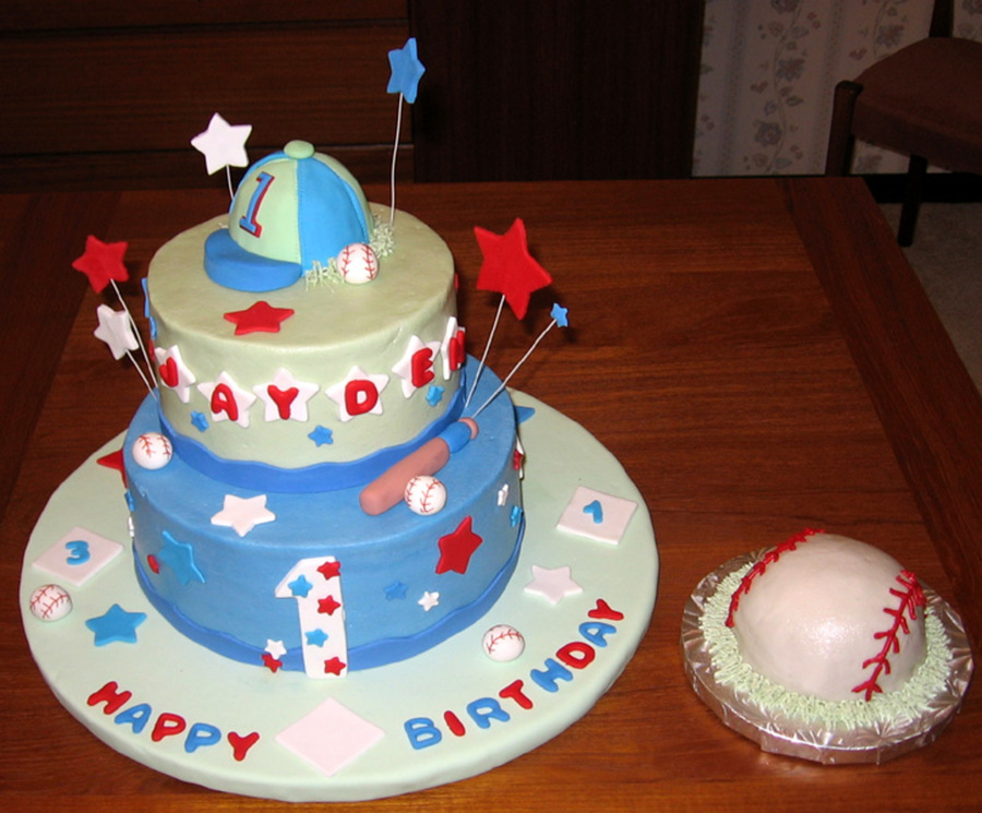 8" yellow and 6" chocolate with buttercream icing and fondant accents. Baseball cap is RKT covered in fondant. Smash cake is a 4" cake carved to a ball shape and covered in buttercream. Cake design is a modified version of a photo provided to me by the customer.