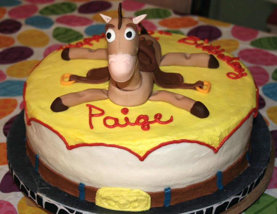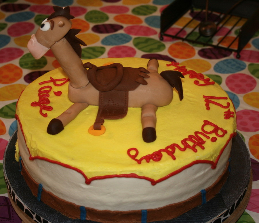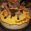Dark fudge Chocolate cake with buttercream icing and fondant Bullseye horse.