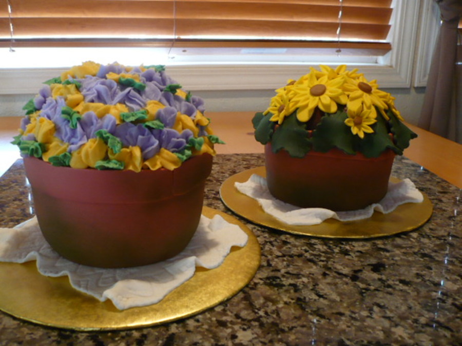 Pots are fondant covered cakes, Pansy is buttercream (urrgggggg I hate piping) and the yellow daisy cake is all fondant. A little green airbrush on the pots for moss.