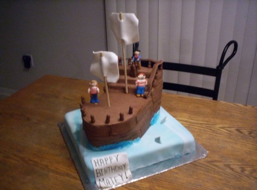 I made this cake for my nephews birthday. He loved pirates at the time. The pirate crew is sculpted out of fondant and made to resemble my brother, his wife, and my nephew.