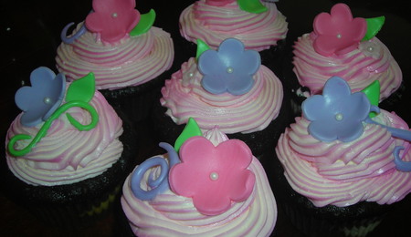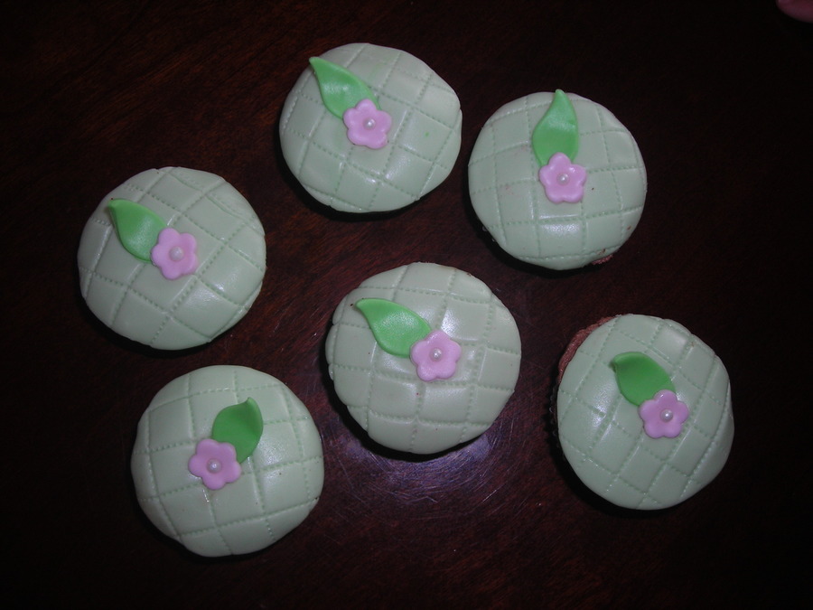 fondant covered mini dark chocolate cupcakes (with a laryer of dark chocolate buttercream). Fondant flowers