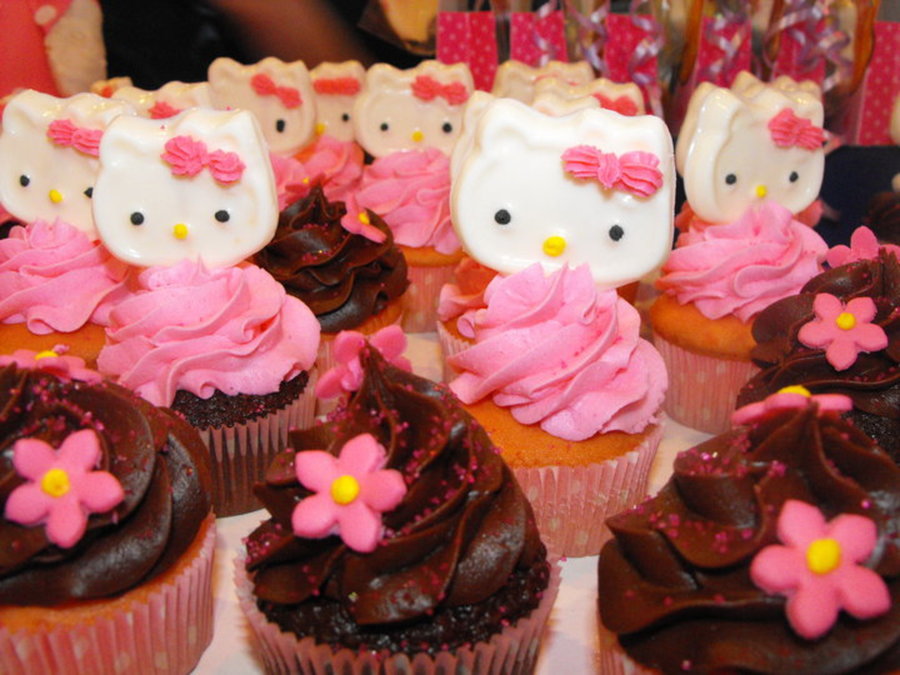 White chocolate Kitty suckers. Buttercream Frosting, fondant flowers.