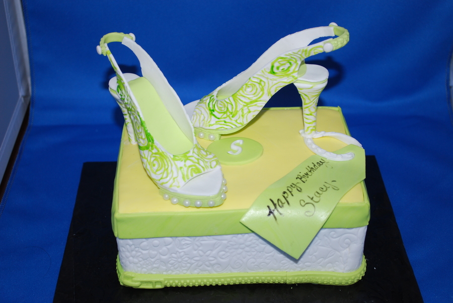 This is a mini cake for a woman who stated she was in the sexy stage of her life. The zipper detail around the bottom of the box is also on the sling back of the shoe.
